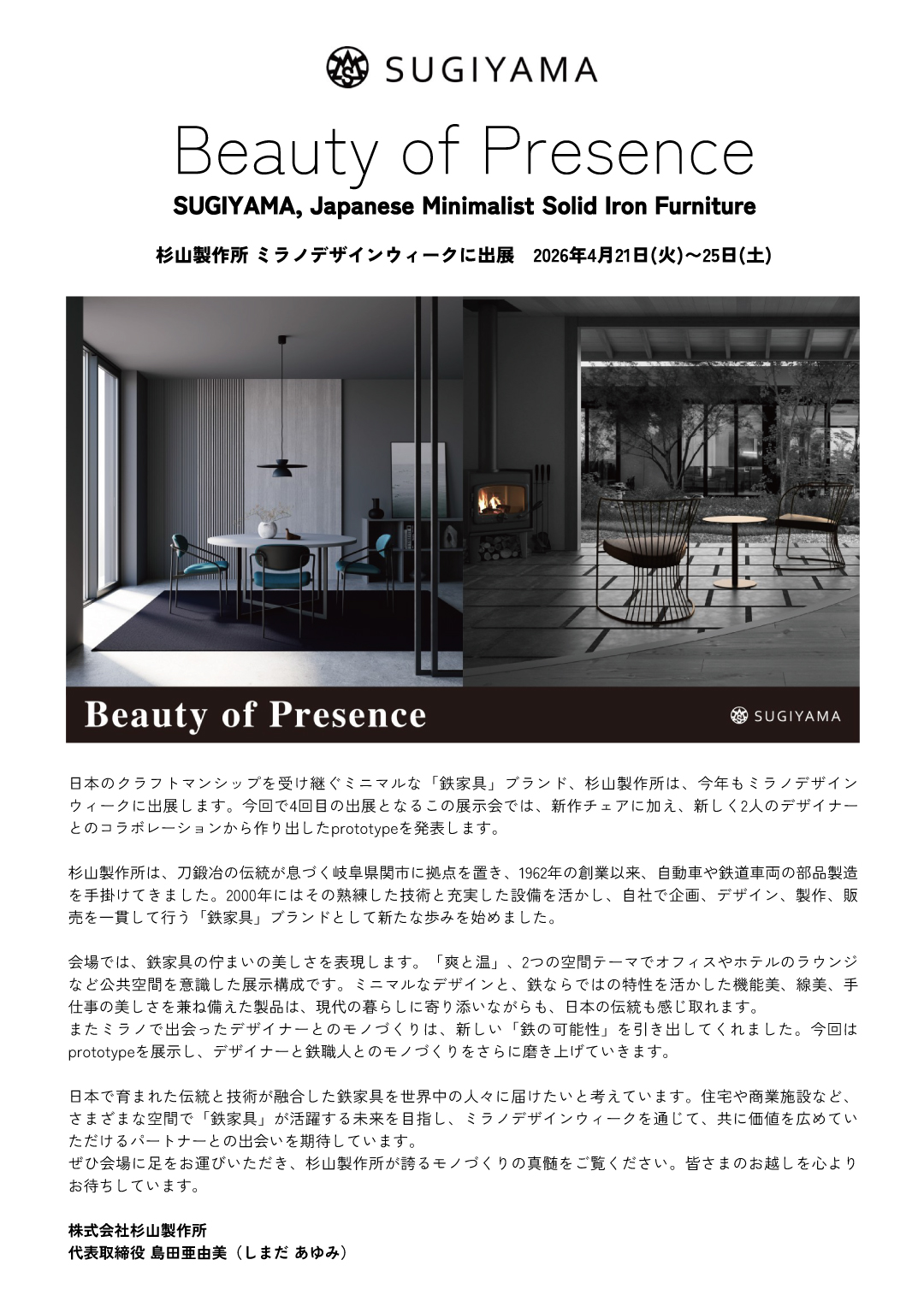 杉山製作所は、2026年4月21日よりイタリア・ミラノで開催される「Milano Design Week 2026」に出展いたします。